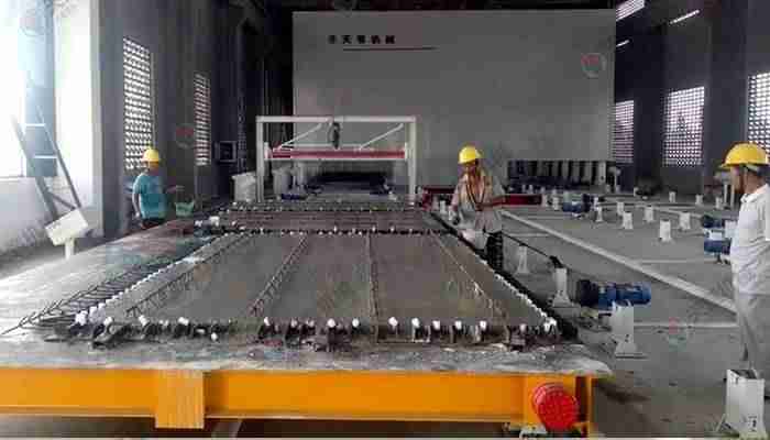 PC環(huán)形疊合板生產(chǎn)線采用高精度、高結構強度的成型模具,經(jīng)自動布料機把混凝土澆筑其中、振動臺振搗后并不立即脫模