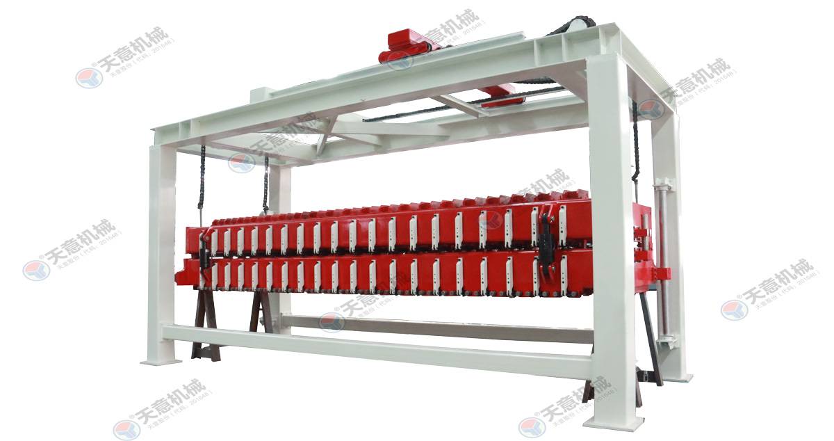 成品分垛吊機(jī):將蒸養(yǎng)車(chē)上的一模坯體吊運(yùn)至掰板輸送機(jī)上,然后將空側(cè)板吊運(yùn)至蒸養(yǎng)車(chē)上;切割工段空翻脫模機(jī)將模框翻轉(zhuǎn)90°,放在切割小車(chē)支座上進(jìn)行脫模,脫模后的??蚺c清理后的側(cè)模板進(jìn)行合模,合膜后的空??虮坏?..